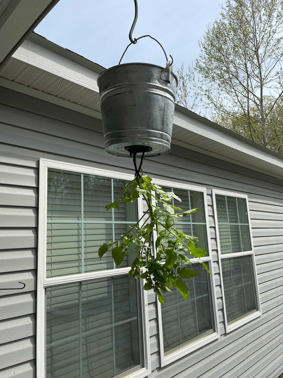 I’ve landed tomatoes in several locations the last few years. We realized last year that the ones we placed in the planters and hanging baskets did well, with little work to steak them. So this year with Frankie’s help, we read up a bit and are having a hanging tomatoes experiment!!